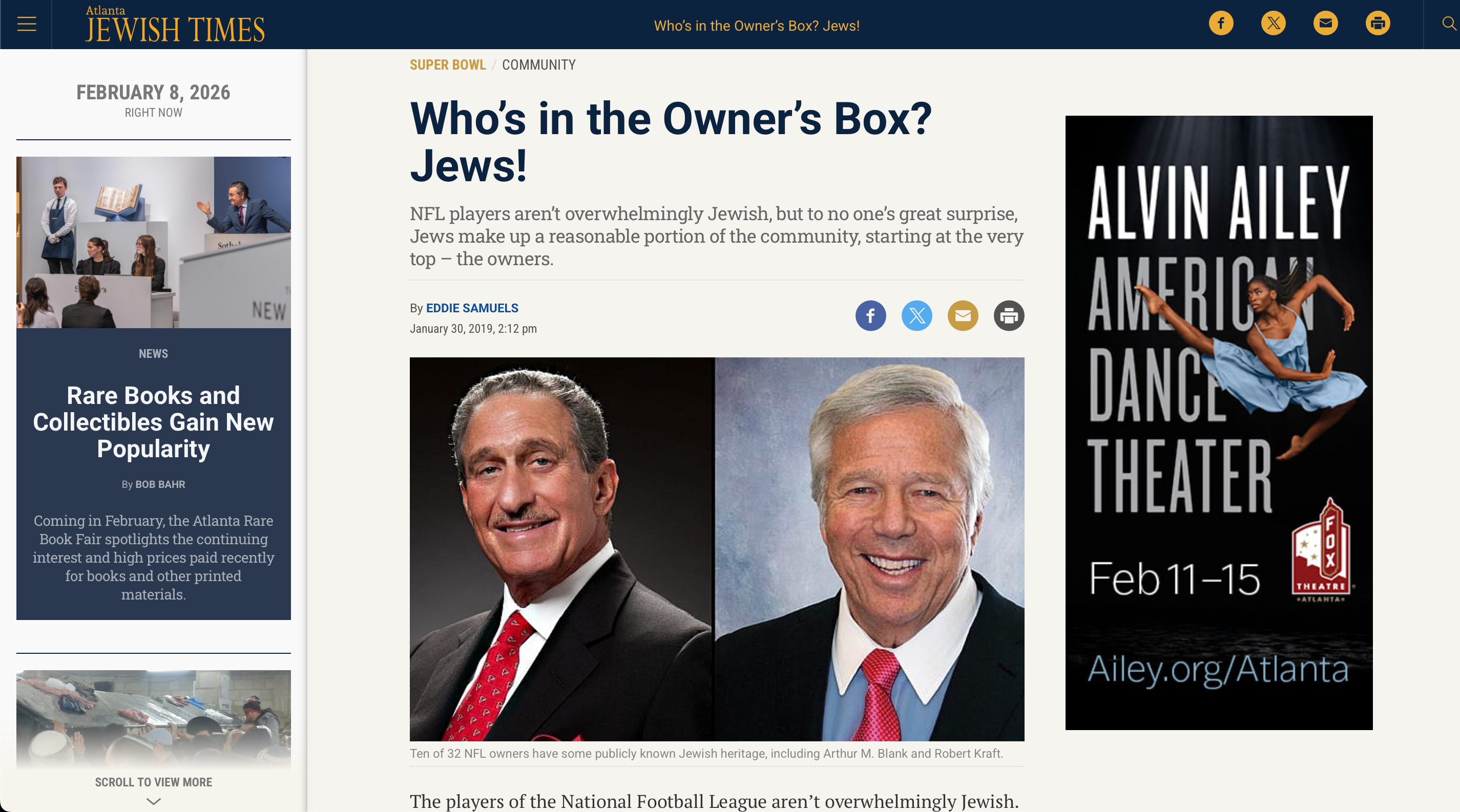 Next of note for Super Bowl LIII is Kraft. Among the most regularly practicing Jewish owners of the NFL, Kraft grew up in Brookline, Mass., at Congregation Kehillath Israel, where his father was a lay leader.