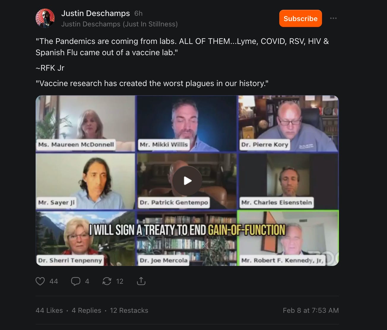 "The Pandemics are coming from labs. ALL OF THEM...Lyme, COVID, RSV, HIV & Spanish Flu came out of a vaccine lab." ~RFK Jr