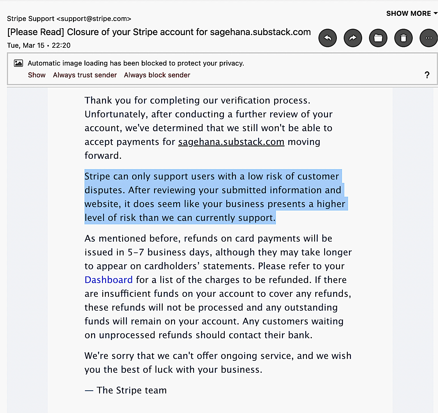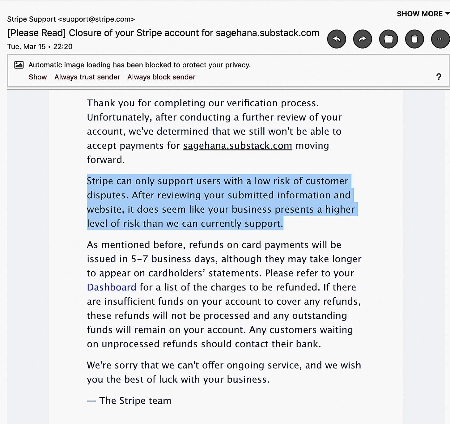 "Stripe can only support users with a low risk of customer disputes. After reviewing your...website, it does seem like your business presents a higher level of risk than we can currently support."